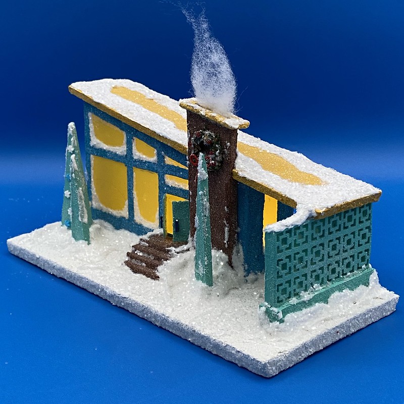 Below are the two mid-century putz I made in 2023. The one on the right has a breeze brick wall. The wall was 3D printed by a friend’s son.