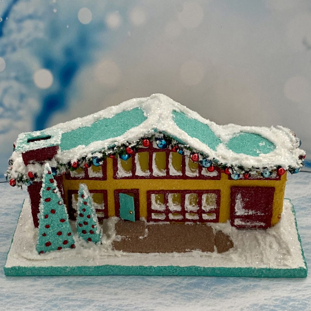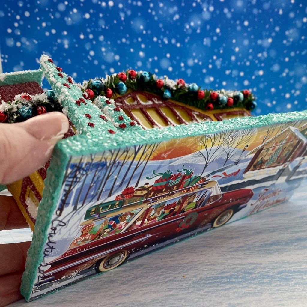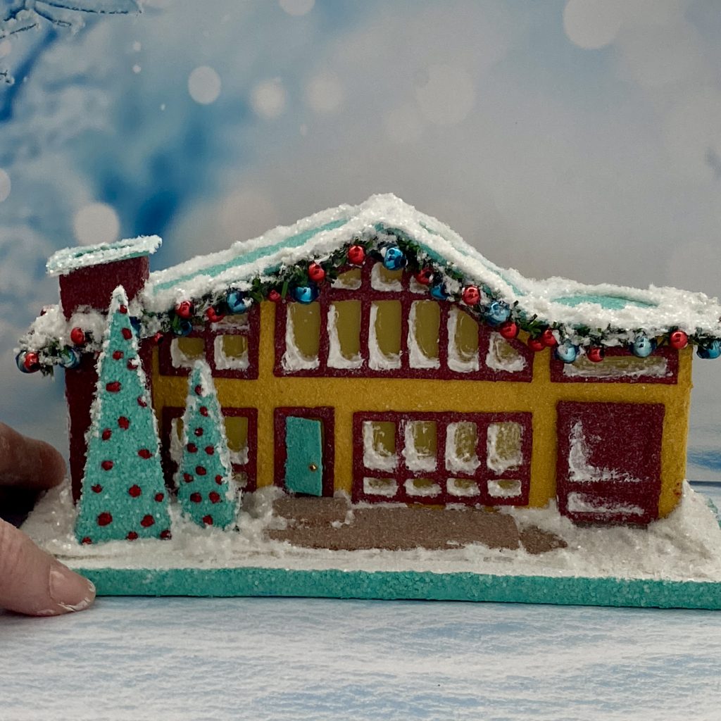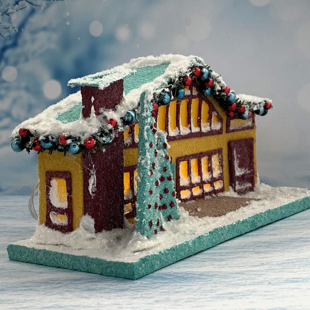 The garland outlining the roofline is made from 1/4″ wide, evergreen chenille stems. I glued blue, vintage, mercury beads and small red beads to the garland as ornaments.