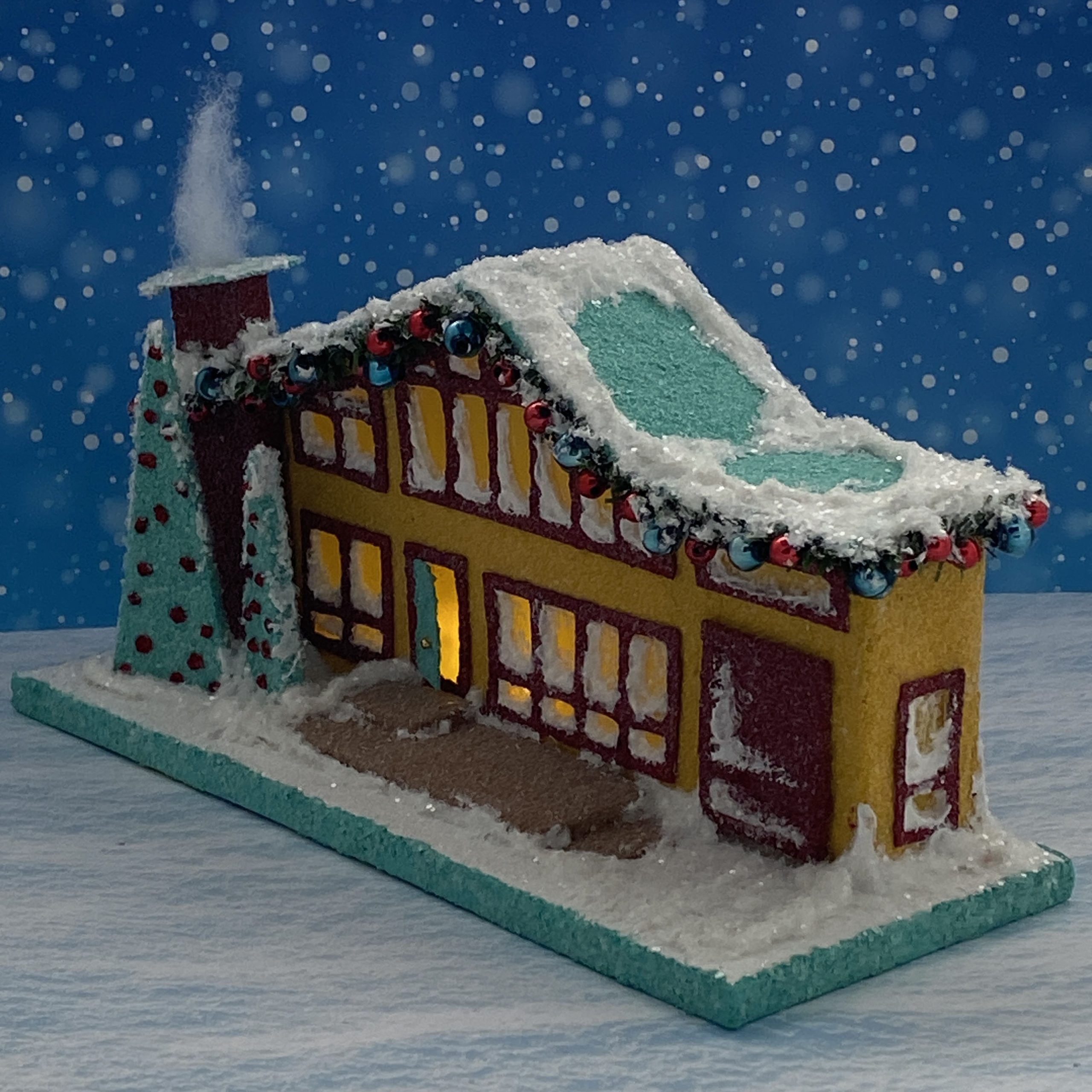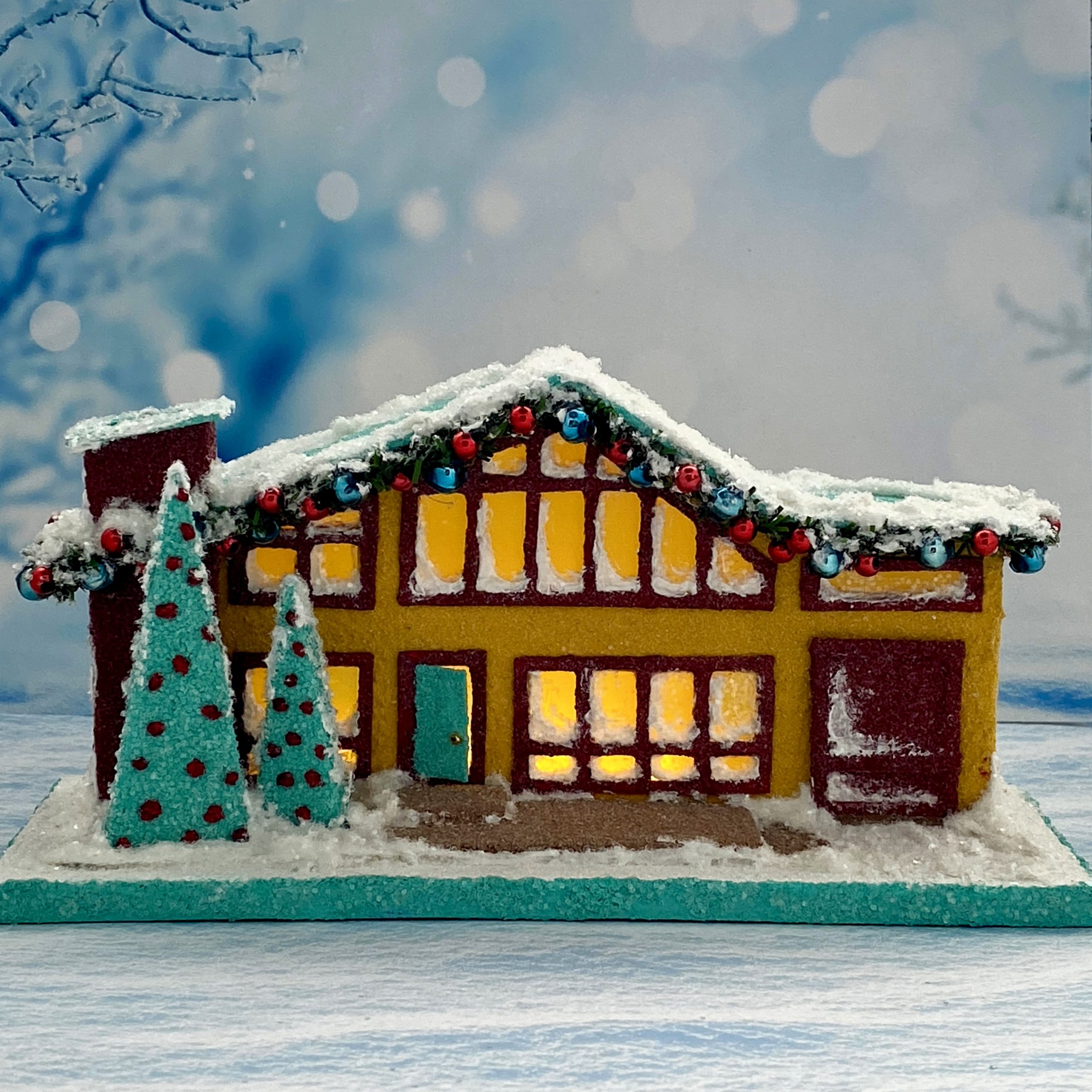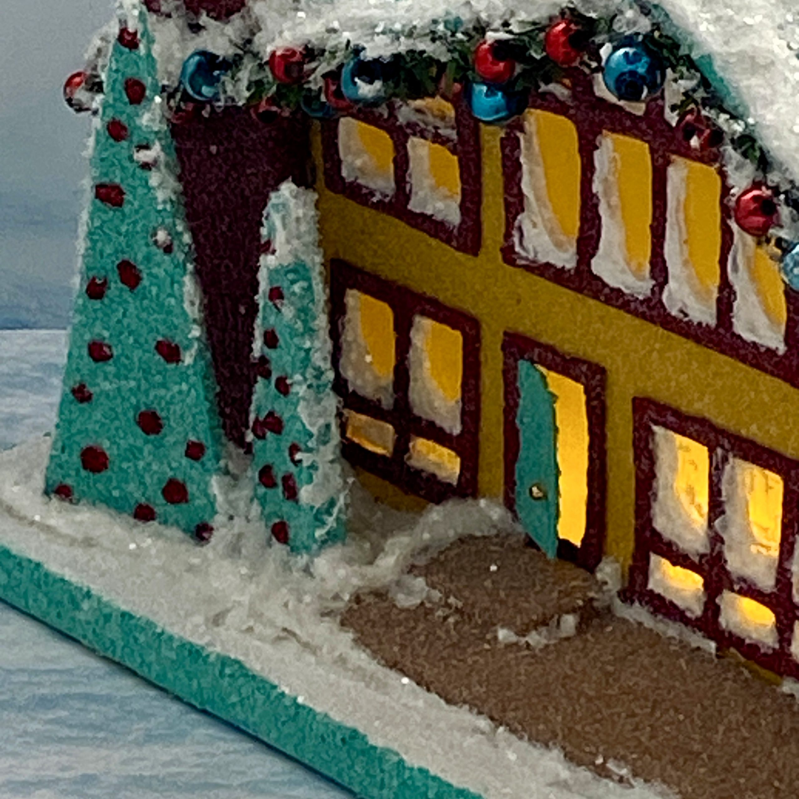 The garland outlining the roofline is made from 1/4″ wide, evergreen chenille stems. I glued blue, vintage, mercury beads and small red beads to the garland as ornaments.