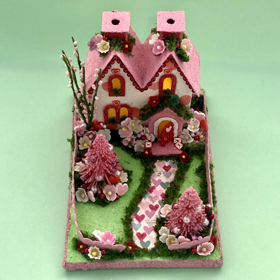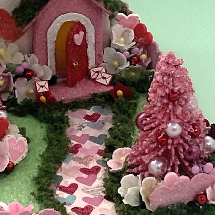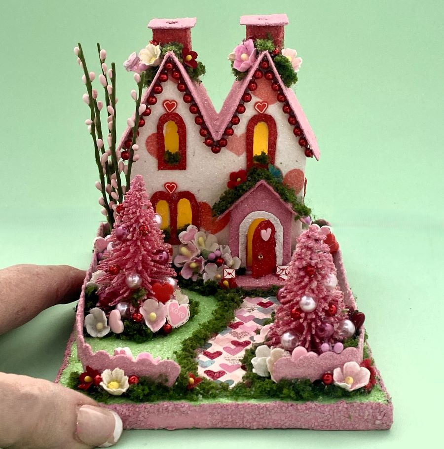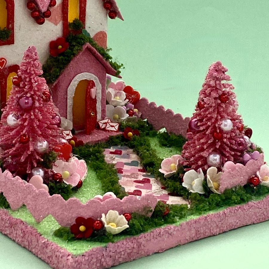 The sidewalk is made from scrapbook paper. It is glued to the base and red glitter glue was used to highlight the red hearts on the sidewalk. A string of tiny beads fit perfectly under the eaves.