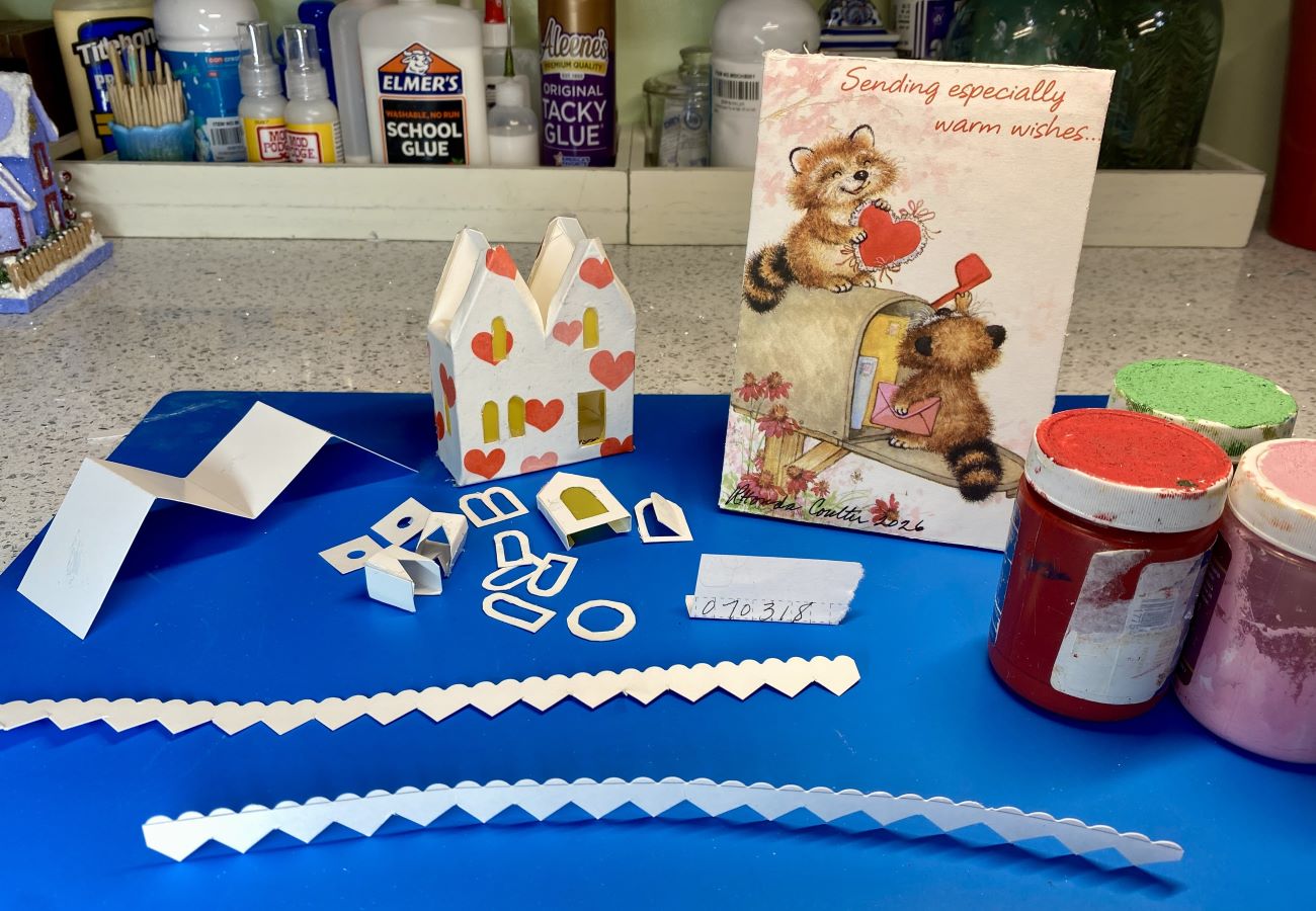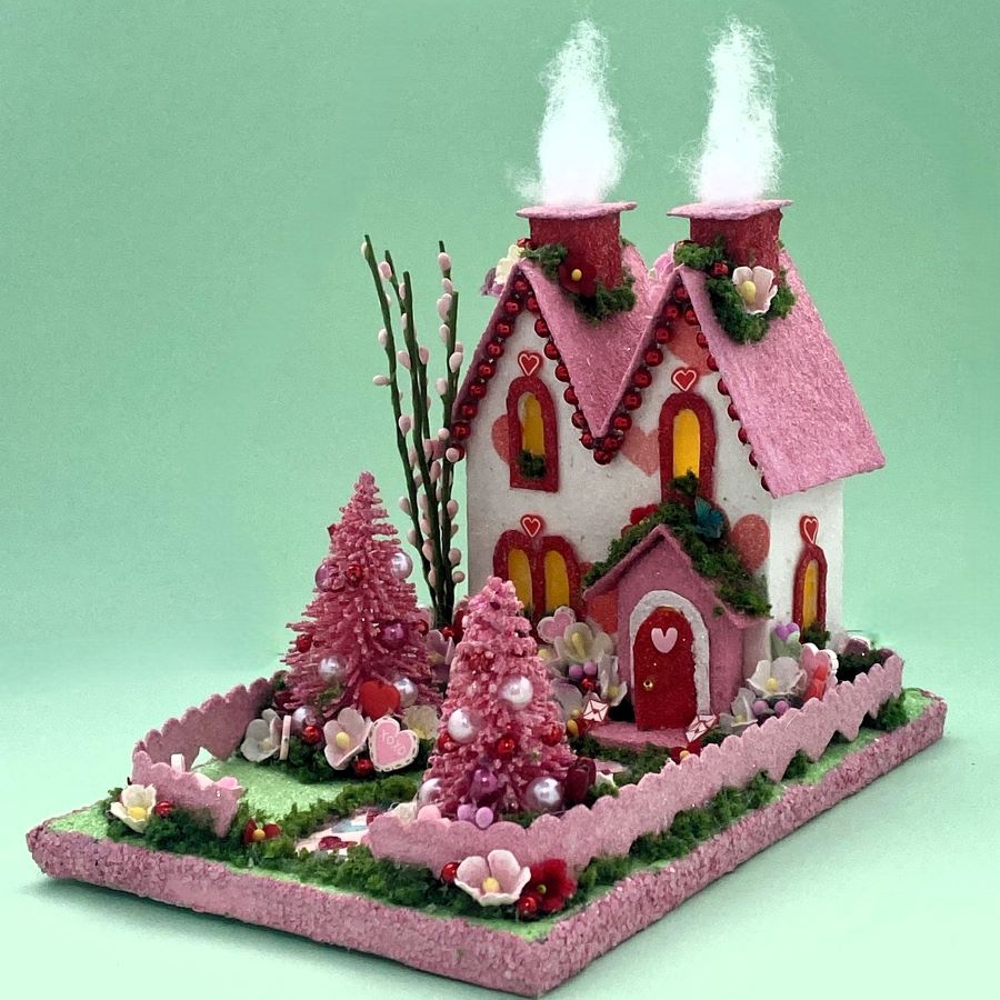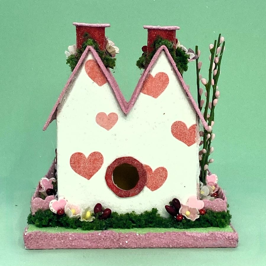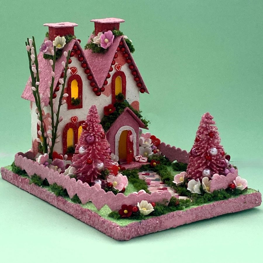 The sidewalk is made from scrapbook paper. It is glued to the base and red glitter glue was used to highlight the red hearts on the sidewalk. A string of tiny beads fit perfectly under the eaves.