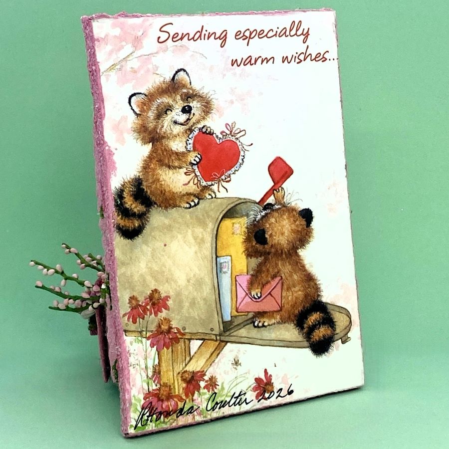 The base is made from an upcycled greeting card that features two raccoons exchanging Valentine cards.