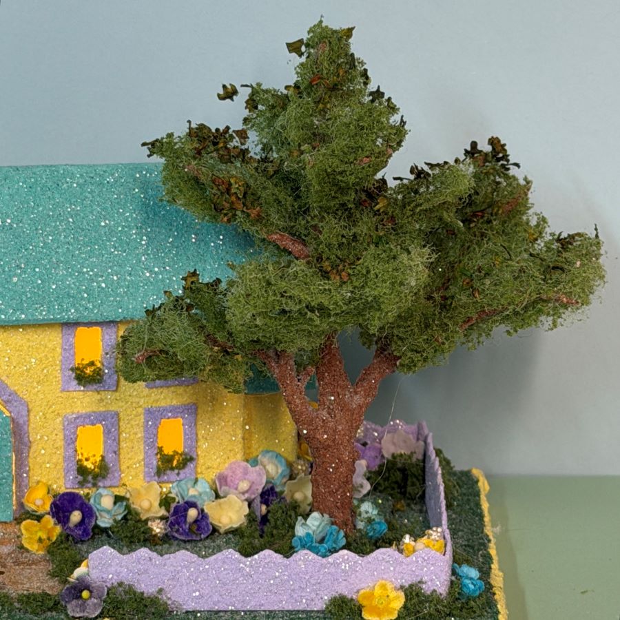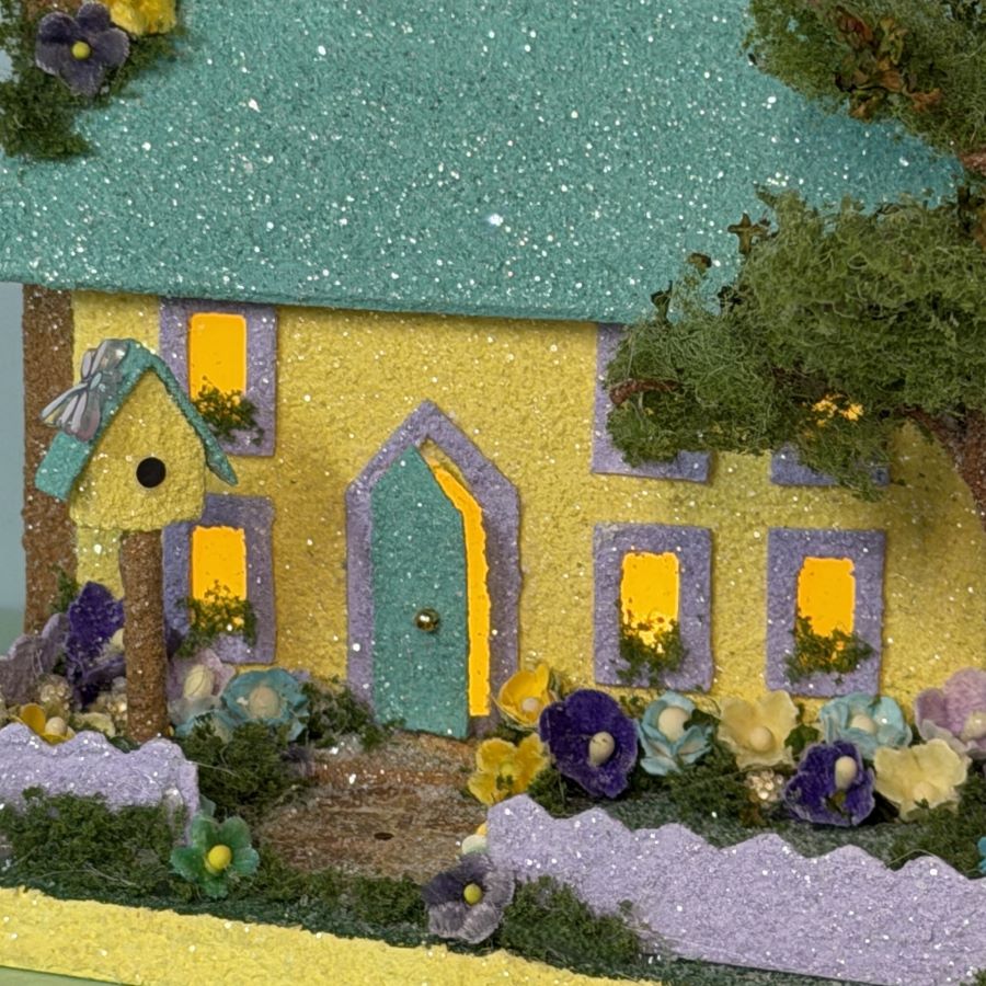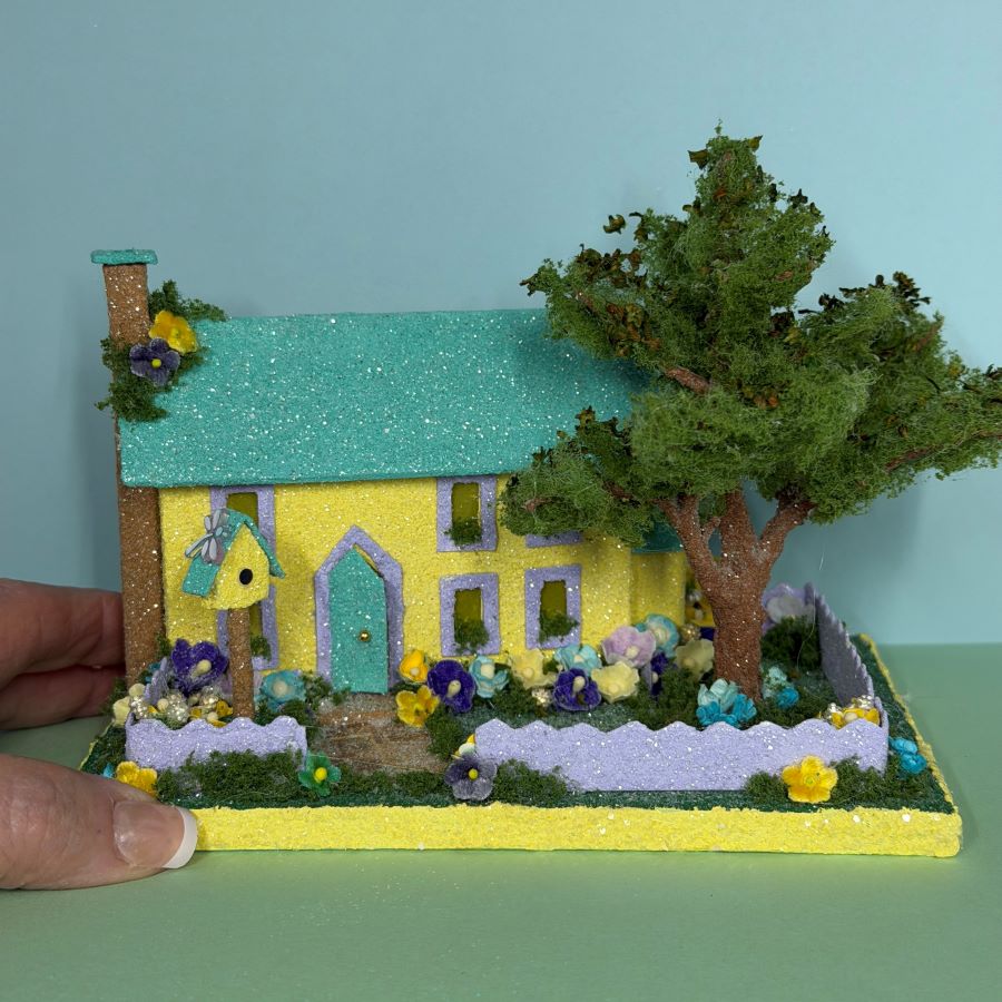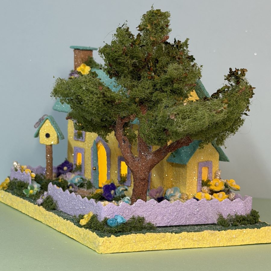 The yard is embellished with velvet forget-me-nots and mulberry paper flowers in colors to match the house.