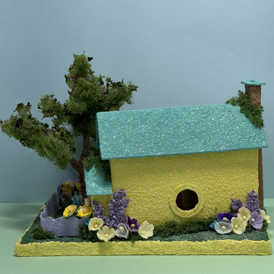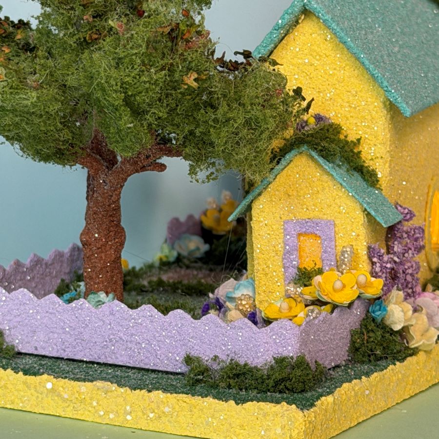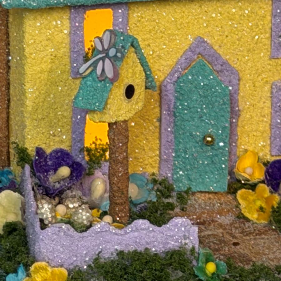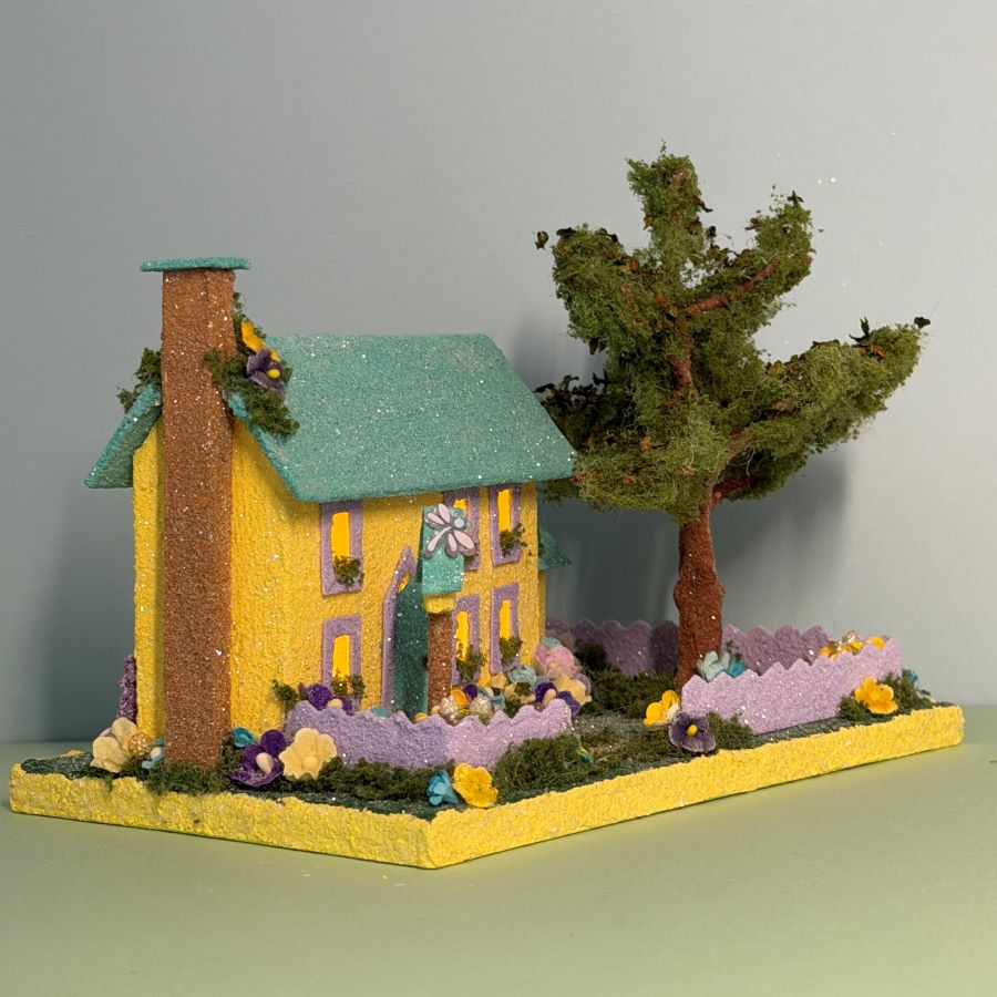 The yard is embellished with velvet forget-me-nots and mulberry paper flowers in colors to match the house.